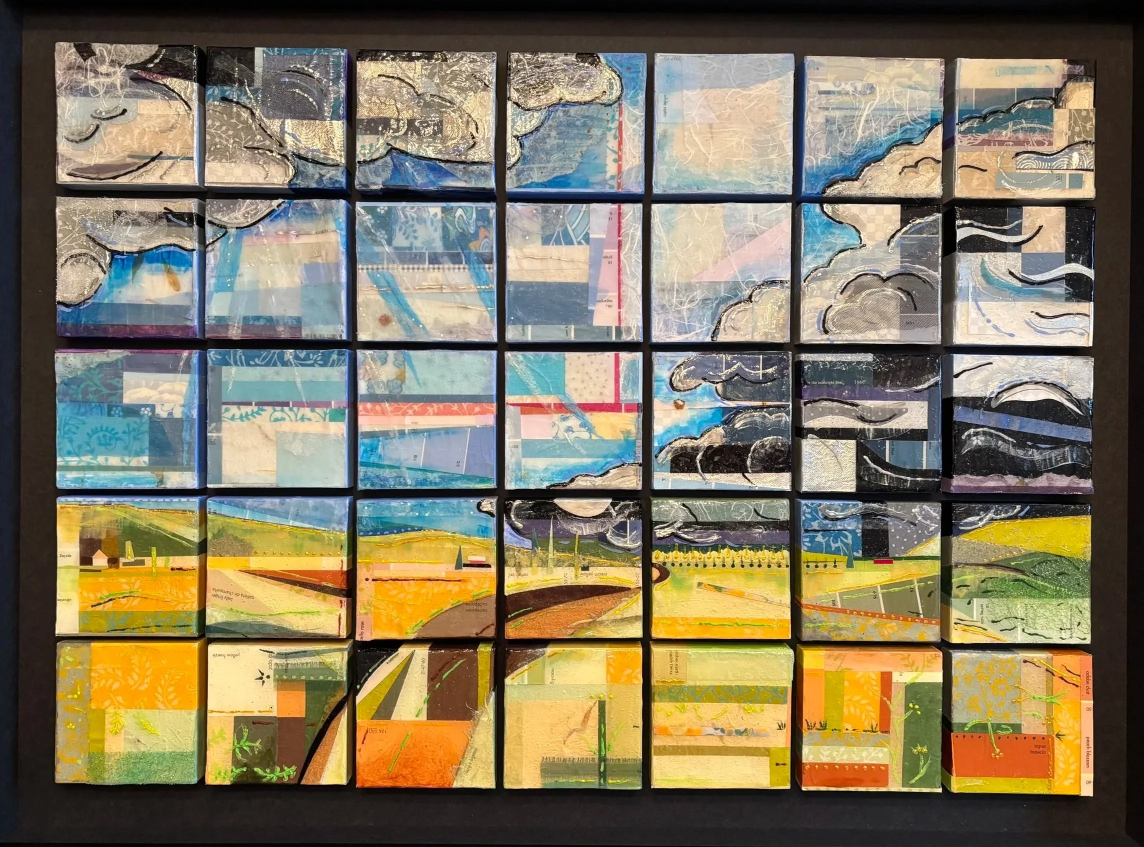 Composed of (35) 4”x4” birch panels, paper, fabric, acrylic clear and matte medium and acrylic paint. 34” x 26” x 2”
